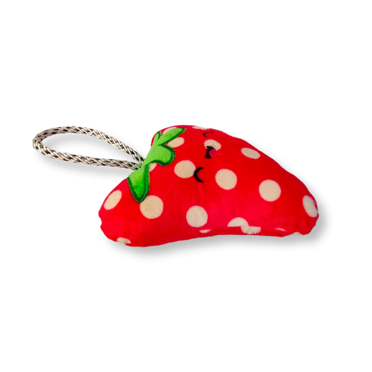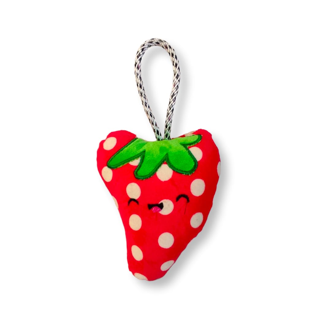 Peluche para perro en forma de Fresa. Cuenta con tela de refuerzo para mayor resistencia y duración. Tiene pito y está relleno de algodón siliconado. Además tiene cuerdapara agarre.