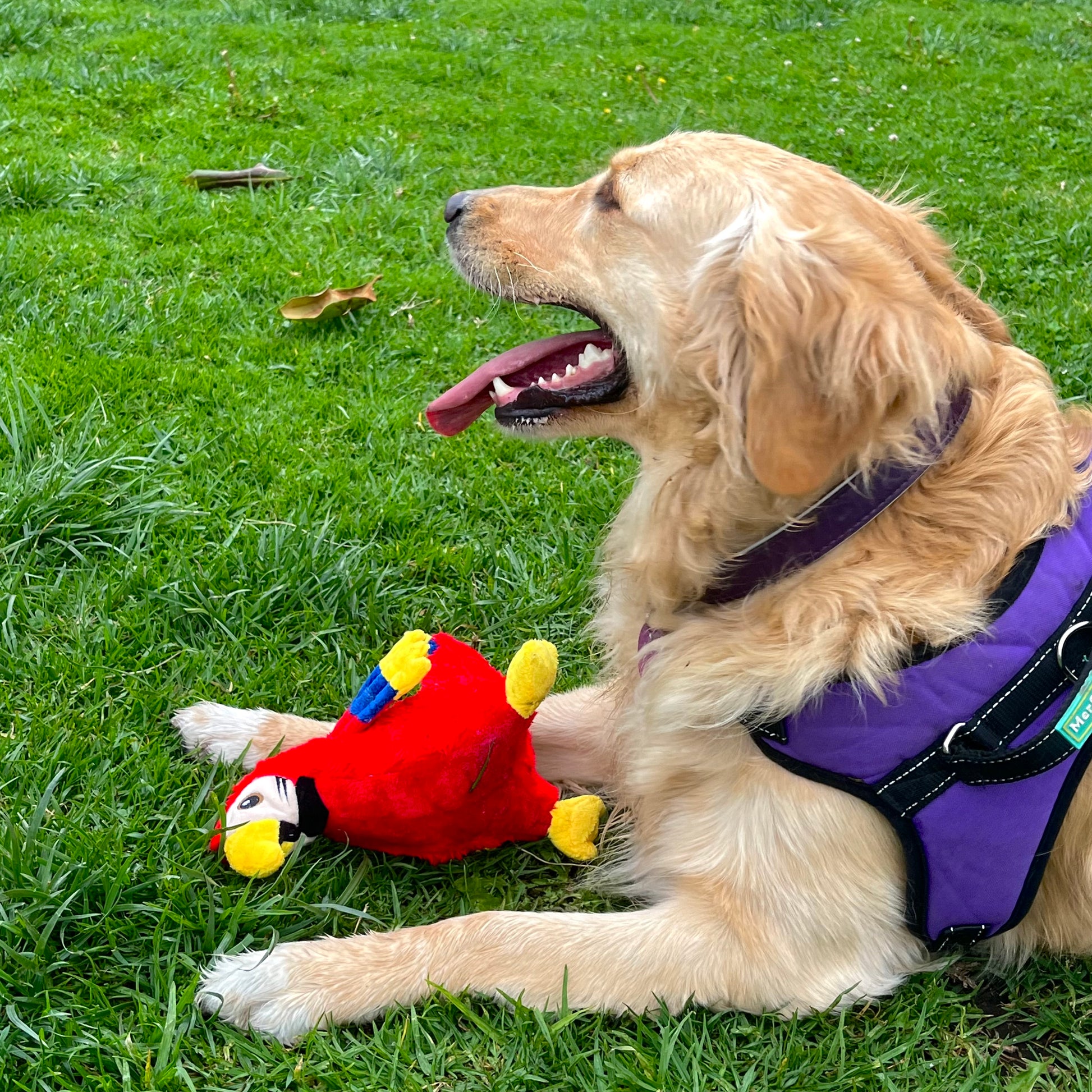 Peluche para perro en forma de Guacamaya Tricolor. Cuenta con tela de refuerzo para mayor resistencia y duración. Tiene pito y está relleno de algodón siliconado.