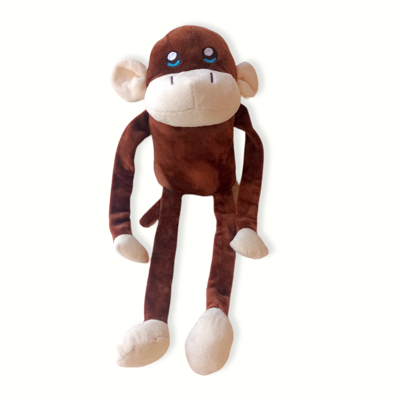 Peluche para perro en forma de Mono. Cuenta con tela de refuerzo para mayor resistencia y duración. Este diseño tiene brazos y patas largas para facilitar la interacción. Estas piezas también lo convierten en un juguete apto para cualquier tamaño o raza de perro.