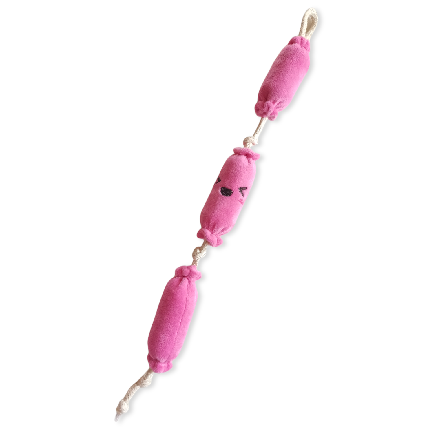 Peluche para perro en forma de salchichas. Cuenta con tela de refuerzo para mayor resistencia y duración. Tiene pito y está relleno de algodón siliconado. Mide 57cms de largo x 5ms de ancho x 4cms de alto.