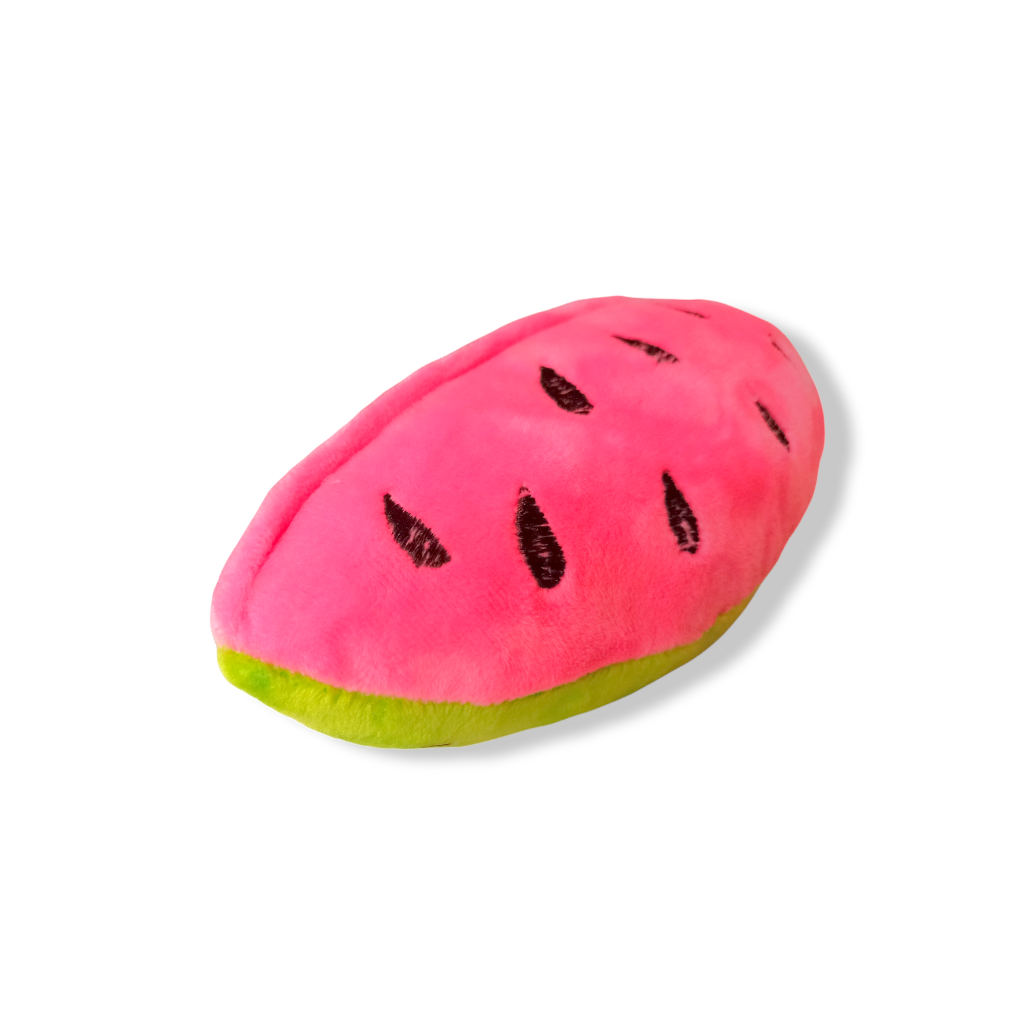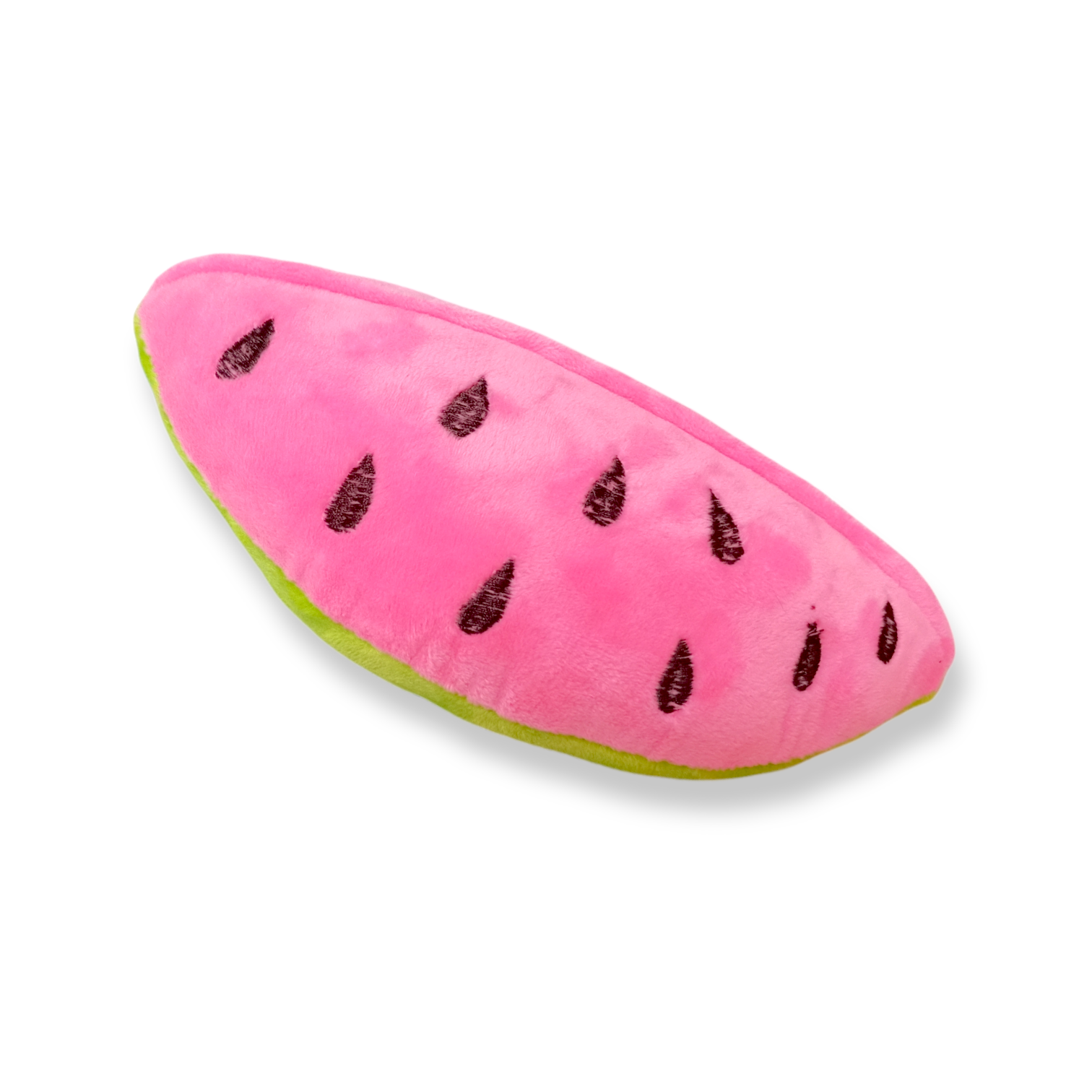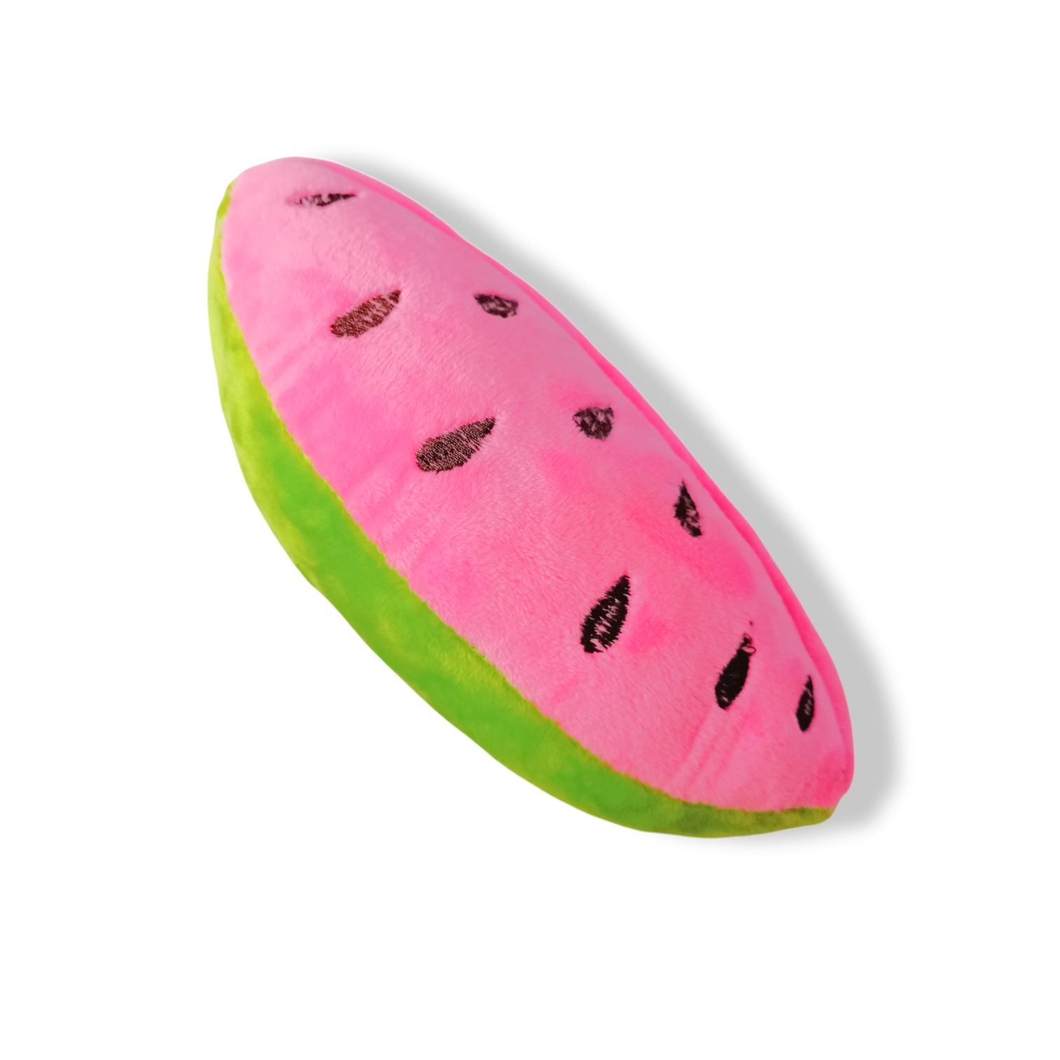 Peluche para perro en forma de Sandía, Cuenta con tela de refuerzo para mayor resistencia y duración. Tiene pito y está relleno de algodón siliconado. Mide 23cms de largo x 14ms de ancho x 10cms de alto.